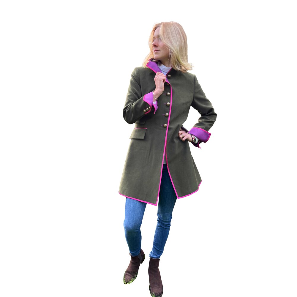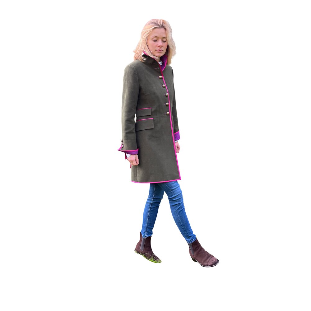 Sportlich eleganter Gehrock aus Oliv-Grünem Lightweight Moleskin mit Pinkem Rips und Baumwoll-Besatz